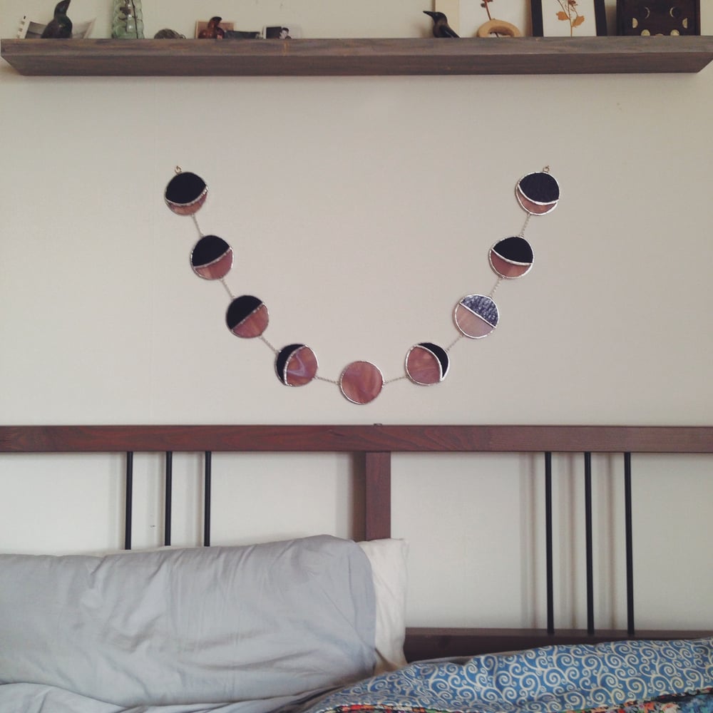Listing for a large custom moon phase. Unlike the ones in my collection, this style features complete circles made in contrasting light and dark shades of stained glass to reflect the light and shadows of the moon phases.