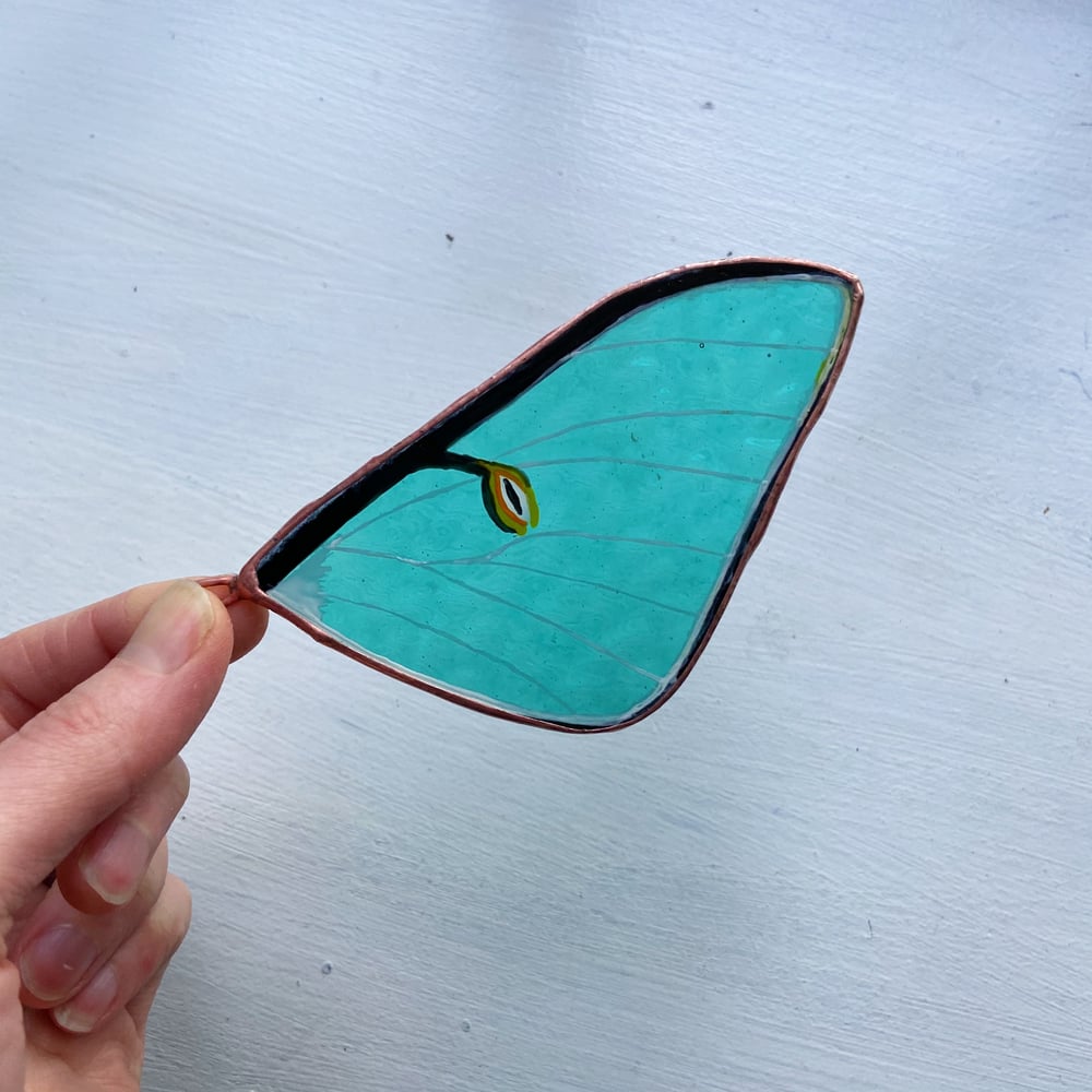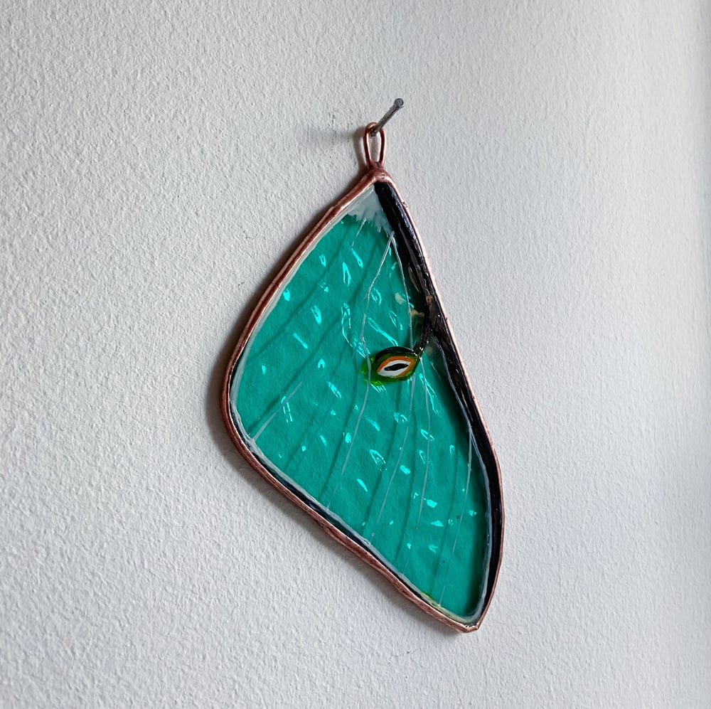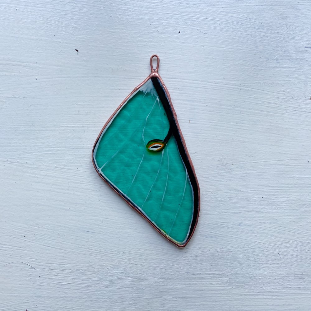 A piece of textured teal stained glass, cut, handpainted and fired to become as permanent as enamel. I painted this wing to mimic a Luna Moth. A discreet copper loop is attached at the top for hanging.