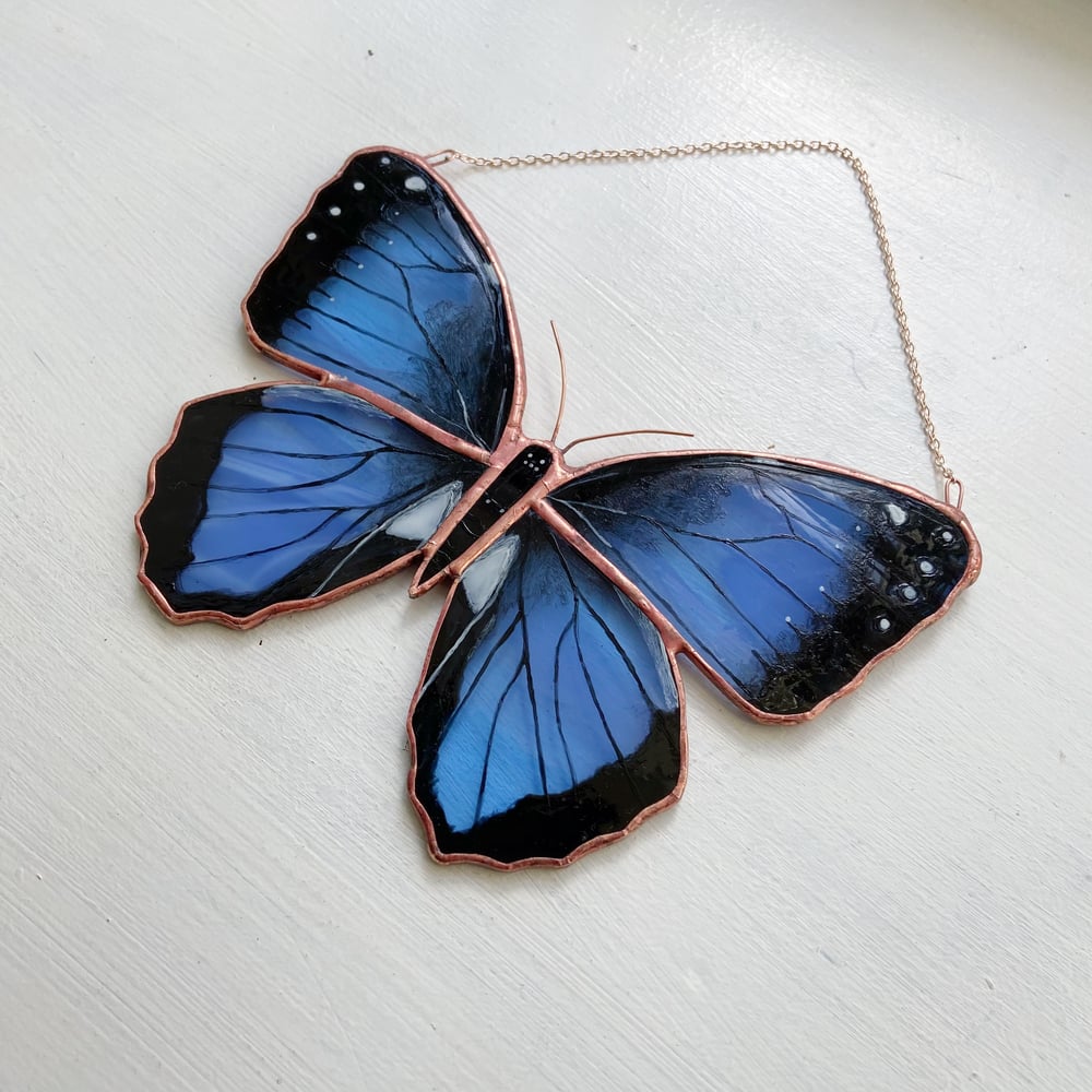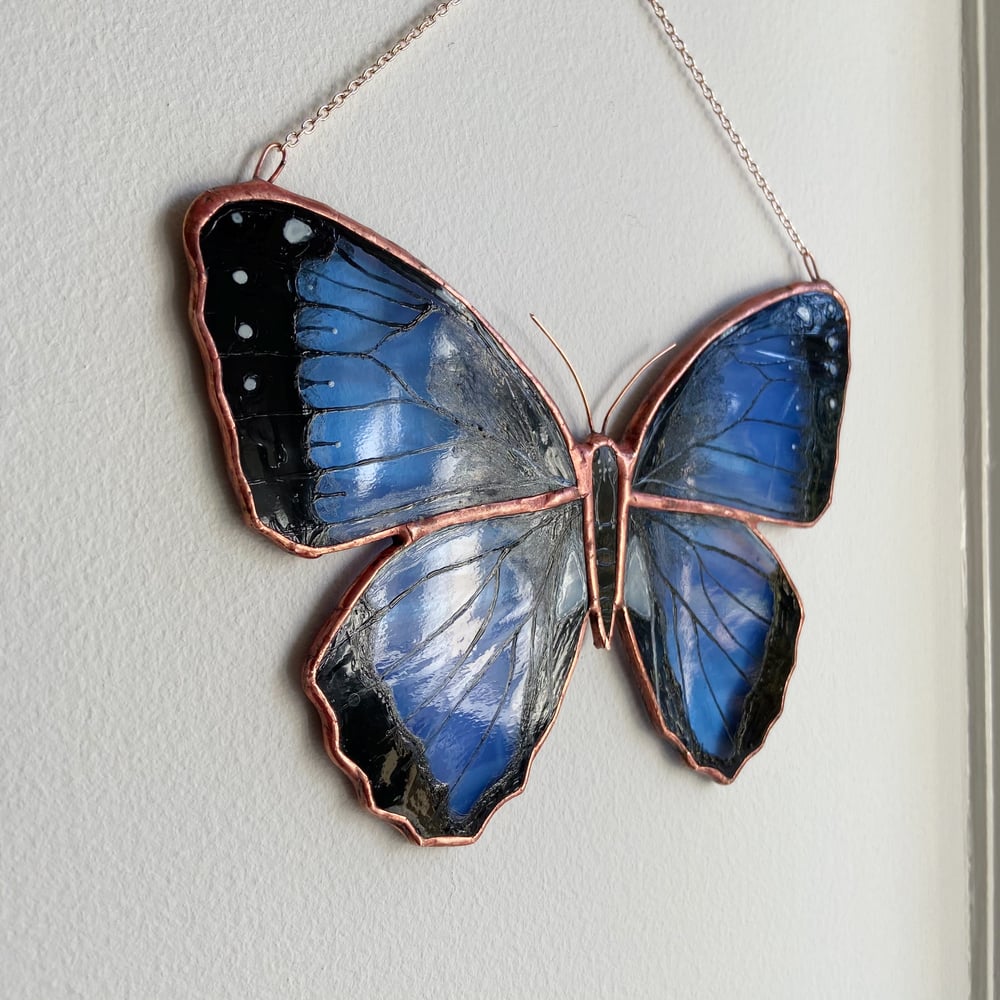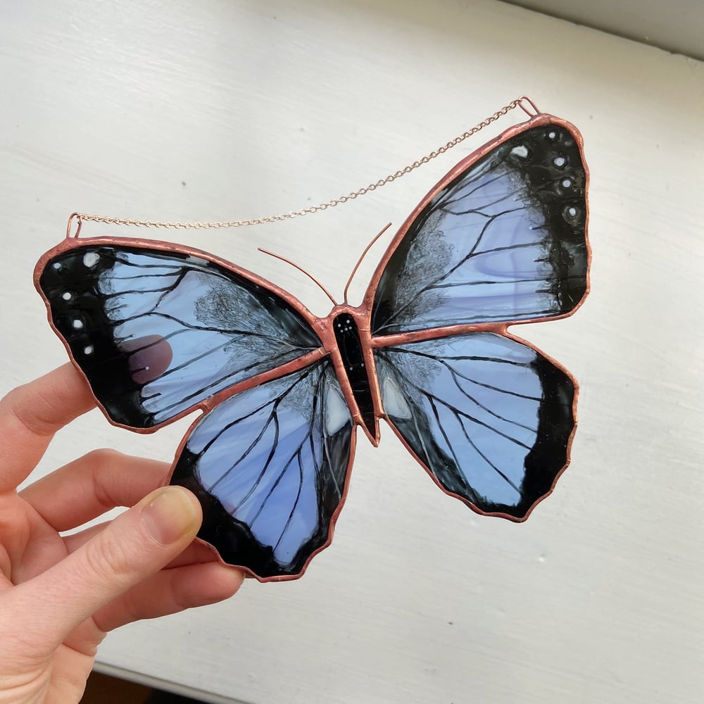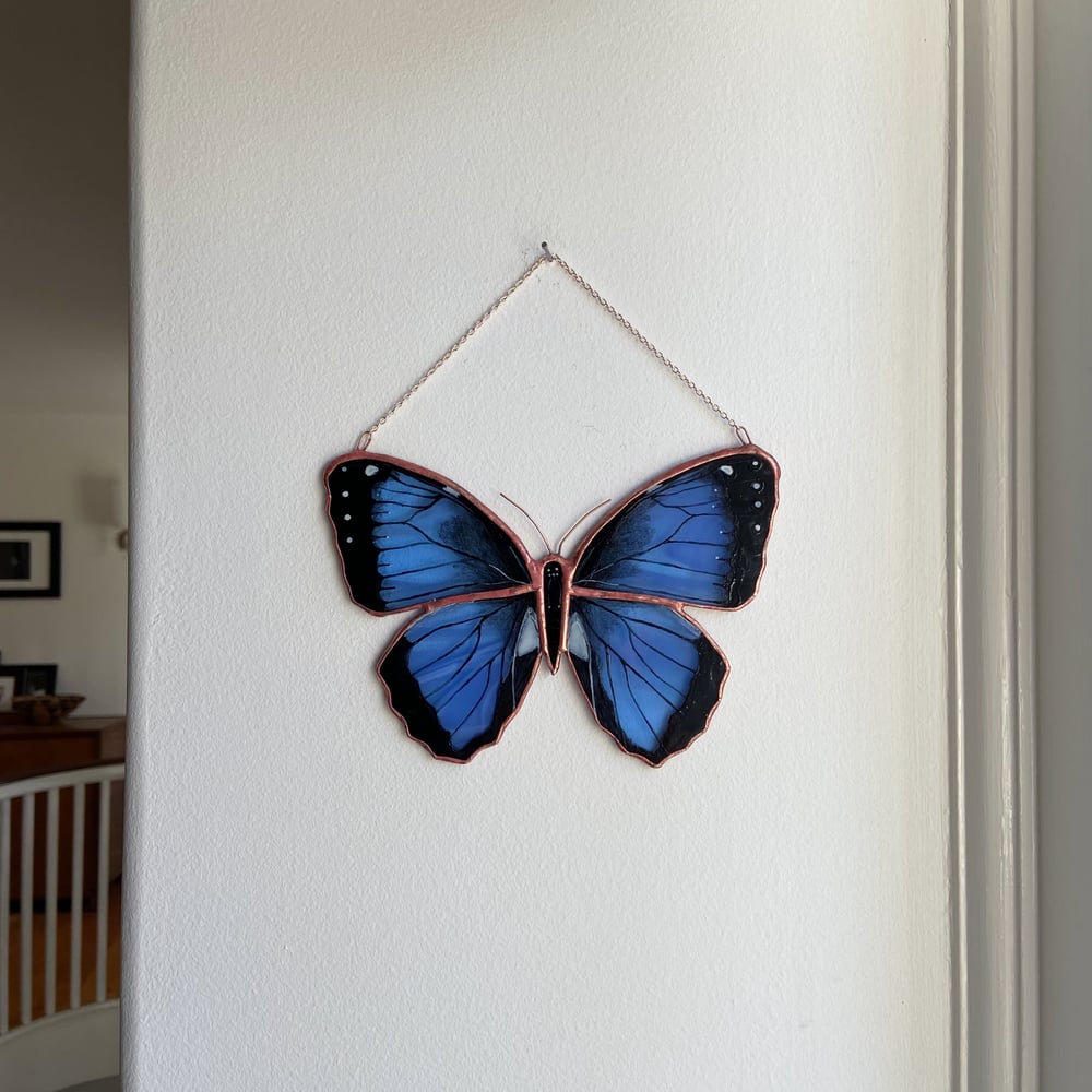 Inspired by the Common Morpho Butterfly, this hanging was cut from a pale blue stained glass, then hand-painted and fired to an enamel finish. Care was taken to replicate the butterfly's wing patterns as faithfully as possible, including the light veining of the wings.